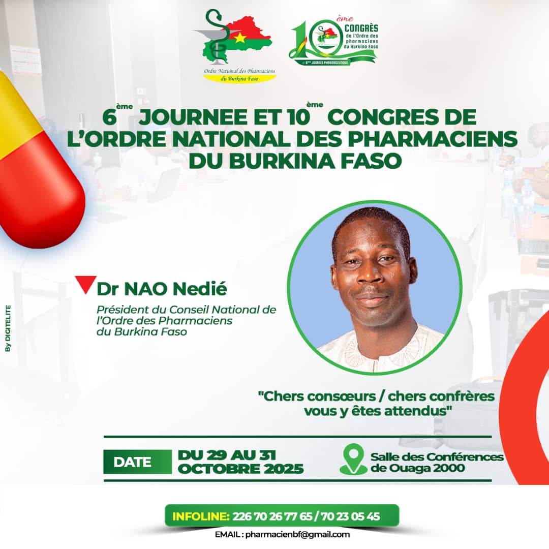 Sous le leadership du Dr NAO Nédié, Président du Conseil National de l’Ordre, la 6ᵉ Journée et le 10ᵉ Congrès de l’Ordre National des Pharmaciens se tiendront du 29 au 31 octobre 2025, à la Salle des Conférences de Ouaga 2000.