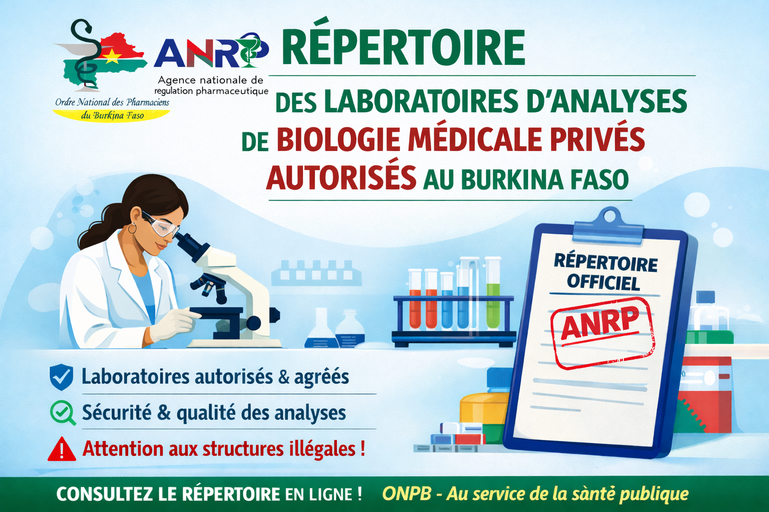 L’Ordre National des Pharmaciens du Burkina informe les professionnels de santé et le public de la publication du Répertoire des 𝐥𝐚𝐛𝐨𝐫𝐚𝐭𝐨𝐢𝐫𝐞𝐬 𝐝’𝐚𝐧𝐚𝐥𝐲𝐬𝐞𝐬 𝐝𝐞 𝐛𝐢𝐨𝐥𝐨𝐠𝐢𝐞 𝐦é𝐝𝐢𝐜𝐚𝐥𝐞 𝐩𝐫𝐢𝐯é𝐬 𝐚𝐮𝐭𝐨𝐫𝐢𝐬é𝐬 𝐚𝐮 𝐁𝐮𝐫𝐤𝐢𝐧𝐚 𝐅𝐚𝐬𝐨 Ce répertoire officiel a été élaboré et publié par l’Agence Nationale de Régulation Pharmaceutique ANRP dans le cadre de sa…